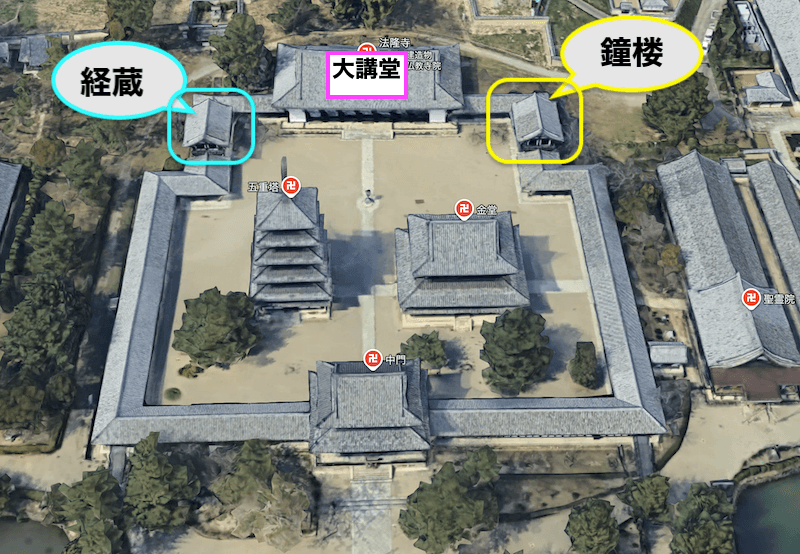殊に、西院伽藍の鐘楼は創建当初、やっぱり景子なほど北側に佇む大講堂と共に廻廊の外側に独立して建立されていたらしい。