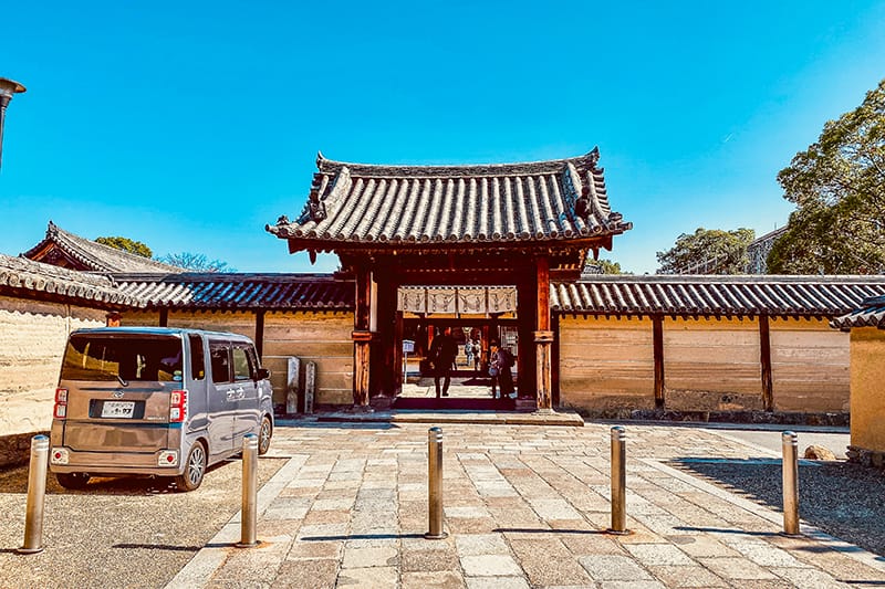 ↑東大門前から見た東院伽藍の姿。この場所から望む東院伽藍は天平の威風と雅趣が感じられる。