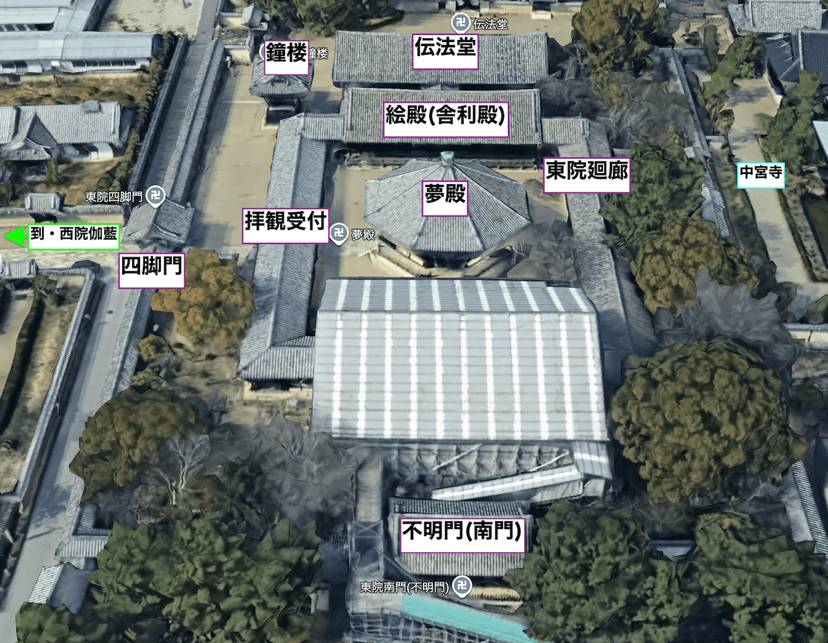 また、創建当初より南門が建てられているなど、独自の通用口を備え、これは西院伽藍とは、まったく異なる区画と太子信仰の聖所だった様子がうかがえる。